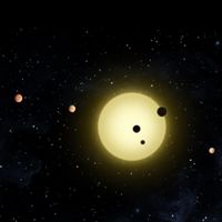 Neben den Daten der neuen Planeten wurde auch die Entdeckung eines 2000 Lichtjahre entfernten Sonnensystems mit sechs Planeten um den gelben Zwergstern Kepler-11 bekannt gegeben. Diese kreisen sehr dicht um den Zentralstern. Der innerste Planet, Kepler-11b, ist nur 1/10 AE von seiner Sonne entfernt, der äußerste, Kepler-11g, nur ½ AE (AE=Astronomische Einheit=mittlere Entfernung Erde-Sonne: 150 Mio. km). „Durch Messung der Größe und Masse der fünf inneren Planeten konnten wir feststellen, dass sie mit zu den kleinsten bestätigten Exoplaneten gehören. Diese Planeten bestehen aus Gestein und Gasen, vielleicht auch Wasser,“ erklärte Jack Lissauer vom Ames Research Center der NASA.
