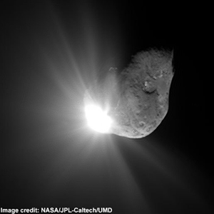 Am 04. Juli 2005 erhielt der Komet Tempel-1 zum ersten Mal in seiner Milliarden Jahre alten Geschichte Besuch von einer irdischen Raumsonde. Deep Impact flog damals nahe am Kern des Kometen vorbei und ließ dabei einen 372 kg schweren Impaktor der Größe eines Kühlschanks auf seine Oberfläche plumpsen. Der Einschlag setzte eine riesige Fontäne aus Gas und Staub frei und verursachte einen Krater, der aber wegen der Staubwolke unsichtbar blieb.