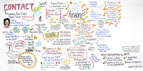 Mit dem Ergebnis des „Contact“ – Panels im Rahmen des GCF, welches die Bedeutung des außerirdischen Kontaktes auf die Entwicklung der globalen Wirtschaft diskutierte, können wir ganz zufrieden sein, denke ich. Allgemeines Fazit des Forums war: UFOs sind real und wir sollten beginnen, über die wirtschaftlichen Implikationen außerirdischer Technologien nachdenken. Natürlich müssen ja gerade die Wirtschaftsbosse ein besonderes Interesse daran haben, diesen neuen Sektor zu erschließen. Da tut sich für die internationale, oder sollte ich besser sagen „intergalaktische“ Marktwirtschaft doch eine ganz neue Zielgruppe auf. Nick Pope ging sogar so weit, die Rentabilität außerirdischer Markenentwicklung und Förderung zu diskutieren. Da müssen sich die Aliens vorsehen, denn wenn´s um den wirtschaftlichen Profit geht, fackelt die Menschheit nicht lange und man ist bereits Geschäftspartner, bevor man selbst davon weiß oder offiziell „Hi“ gesagt hat. Aber Spaß beiseite: der allgemeine Tenor war äußerst positiv, vor allem weil die Diskussion auf einer Ebene geführt wurde, welche die außerirdische Präsenz nicht in Frage stellte, sondern als gegeben voraussetzte. Ein Hauptthema war auch die Rolle, welche ein Kontakt in der gegenwärtigen Energiekrise in Bezug auf die Erschließung neuer Energiequellen spielen könnte. Neben dem wirtschaftlichen Aspekt wurden aber auch ethische Fragen diskutiert. Zoaghloul El-Naggar betonte z.B., dass es ethisch fragwürdig sei, offiziell Kontakt mit außerirdischen Zivilisationen aufzunehmen, bevor wir hauseigene Probleme wie Kriege und Armut nicht im Griff haben. Die Künstlerin Sunni Brown fasste die wichtigsten Punkte der Diskussion in einer Graphik zusammen: