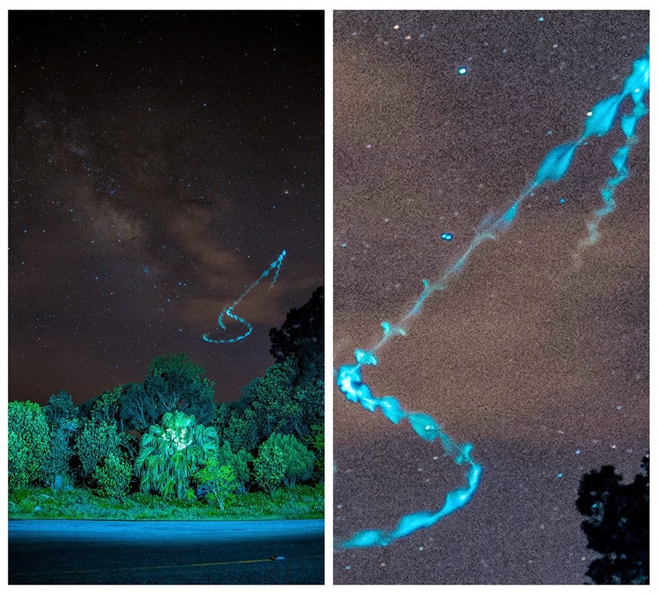 Während einer Hochzeitszeremonie in Taiwan konnte der Photograph eine ungewöhnliche Erscheinung am Nachthimmel auf einem Bild festhalten. Aufgrund der Belichtungszeit von 20 Sekunden zeichnete sich eine ungewöhnliche Flugbahn eines blau leuchtenden Objektes ab. Die spiralförmige Flugbahn weist darauf hin, dass sich das Objekt im Flug gedreht hat. Dem Photograph selbst fiel während der Aufnahme nichts Ungewöhnliches auf; er bemerkte das Objekt bzw. dessen Flugbahn erst auf dem Bild. Evtl. könnte es sich hier um einen Vogel handeln, dessen Flugbahn durch die lange Belichtungszeit stark hervortritt. Interessant ist die Aufnahme auf jeden Fall.