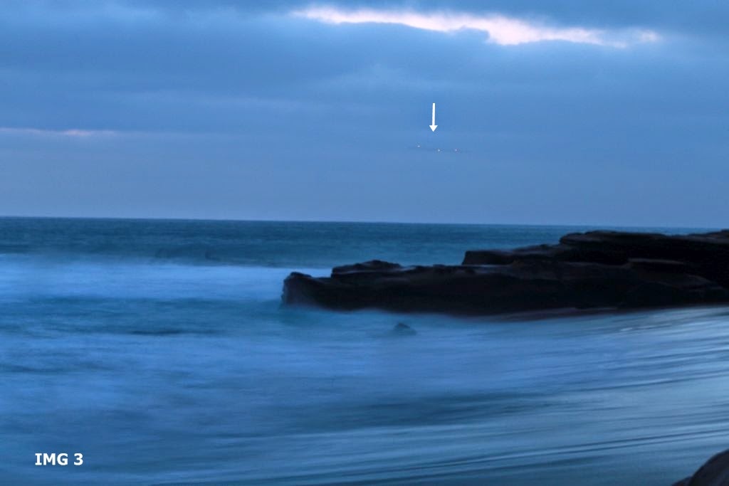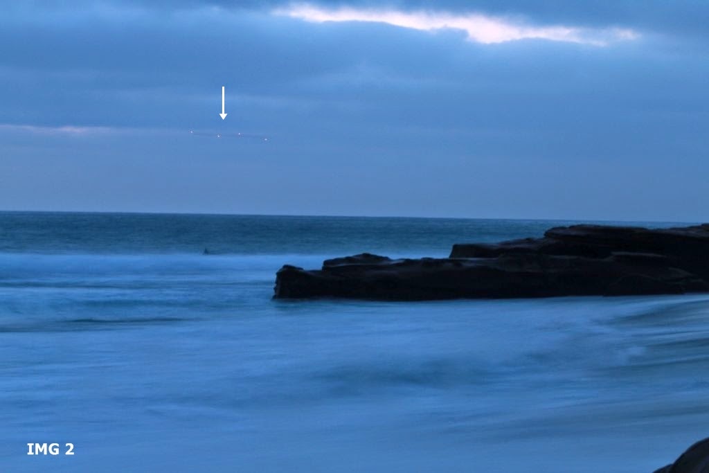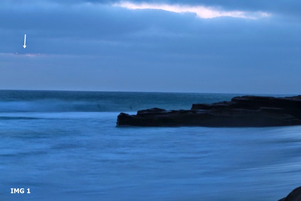Am Strand von La Jolla entstanden am 31. März 2015 drei interessante Aufnahmen, die scheinbar ein großes, zigarrenförmiges Objekt mit vier roten Lichtern über dem Meer zeigen. Die Aufnahmen entstanden über einen Zeitraum von 10 Minuten, während der das Objekt seine Position veränderte.