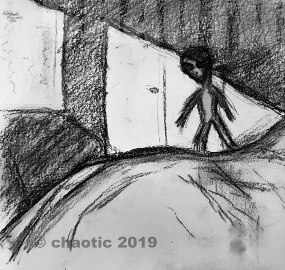 Experience of chaotic at the age of about 8 or 9, when he stayed over at his grandmother's house from time to time. "One of the shadows in the doorway broke away from the other two. He ran into the room. I looked at him and fell back on my elbows. The black silhouette ran around the bed, stepping in front of the bedroom closet, which was half-lit by the window. I saw the person's light legs. Then the upper body. My gaze traveled upward with the cone of light from the streetlamp. When the head was illuminated, I was startled! In shock, I threw my gaze to the left toward the window. I didn't want to look at the person." The next morning his grandmother told that in her childhood she had been visited by the "Heinzelmännchen" (dwarfish creatures that are part of german folclore) who had told her not to be afraid.