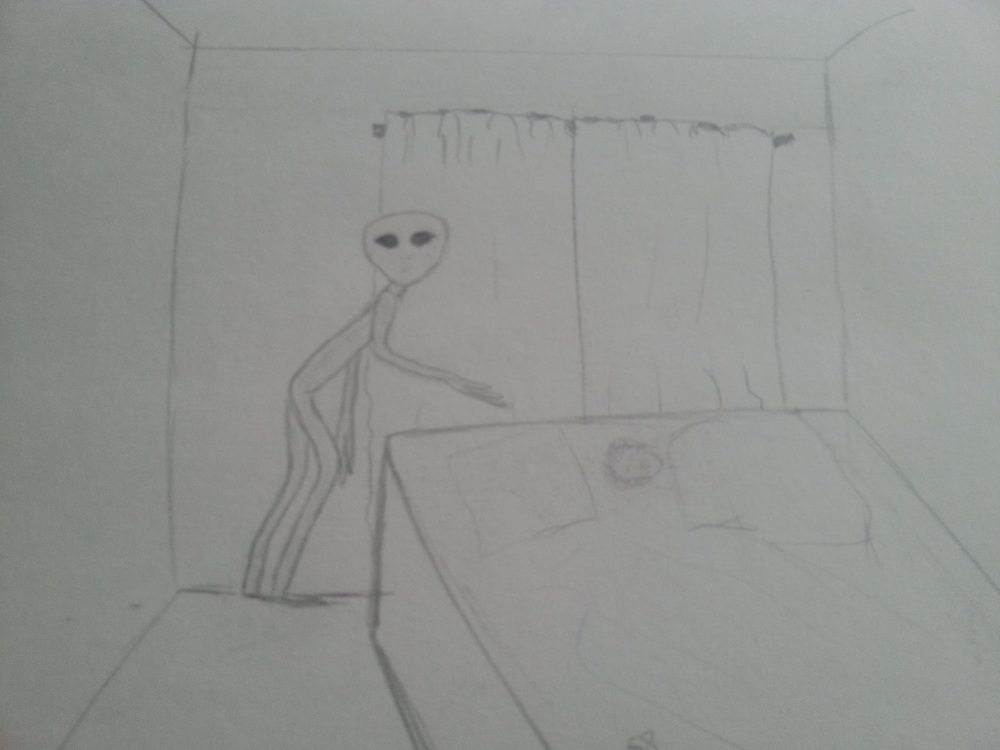 Image by dani88 about her first conscious encounter with a Grey. "I was lying in bed with my husband and daughter next to me. The gray just came through the door and without words ran towards the headboard to the window. I screamed, 'Oh my God,' and jumped up, my husband with me. The gray bent to my daughter and stretched out his hand to her. And both of us in shock just looked at him, I then said, "Remember this, don't forget this, it's real." Only after this sentence he turned his head to me and looked at me. I don't know what happened after that. I woke up in bed as usual."