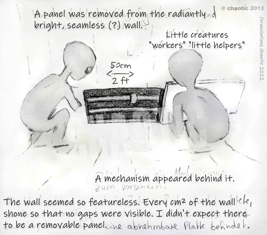 The walls onboard appear mostly smooth and seamless. chaotic managed to take a possible look behind the scenes: "We were standing in one of the rooms at the far end of the ship. Smaller workers, barely three feet tall, approached and removed a panel from the wall. Behind it, two pipes were revealed. He [my "guide"] explained to me that these pipes would extend in a ring, going along the rim [oft he ship]. He also told me the purpose of the rings. Each ring creates a variable, oscillating field that interferes with the field of the other ring. The variation in oscillation leads to local differences in the interference, allowing the ship to travel through space in a controlled manner. It wasn't electromagnetism. In the same context, I remember a display with complicated formulas in our mathematics and sine curves. Of which I understood nothing at that time. I was no longer afraid at that point. I only felt curiosity."