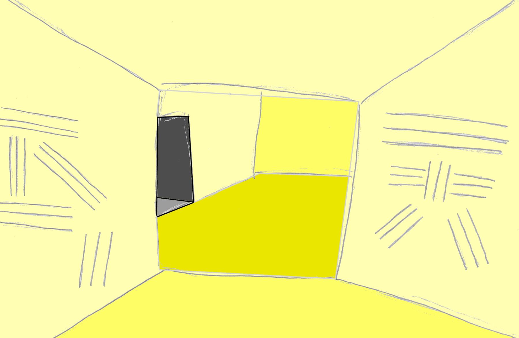 Beschreibung von Ford: "In einem großen Raum, welcher möglicherweise ein Hangar war (oder was auch immer die Fremden dafür benützen) stand ein Objekt, welches einen kleinen Eingang besaß. Dieser war gerade mal so groß, dass ich mich hindurchzwängen konnte (vielleicht 50x50cm). Drei kleine Graue standen vor diesem Objekt und bedeuteten mir, dass ich einsteigen soll. Beim Hereinklettern musste ich durch einen engen Gang. Dabei entdeckte ich an den Wänden Symbole, die wie eine Beschriftung des Raumes aussahen, in den ich einsteigen sollte (das sind die sternförmigen "gekratzten" Zeichen auf meiner Zeichnung).“ Durch einen Zugang gelangt Ford in einen recht niedrigen Raum, der trüb-gelblich ausgeleuchtet ist – alles wirkt wie in Bienenwachs getaucht. Ein dunkler Raum ist erkennbar, in dem eine Art metallischer Block steht, der wie ein Tisch oder Altar wirkt. An diesem Punkt bricht die Erinnerung ab. „Für mich ist bei diesem Erlebnis ganz wichtig, dass ich mich ganz klar an diese Zeichen im Eingangsbereich erinnern konnte. Immer wieder sehe ich ähnliche streng geometrische Muster, die mich an Zahlen erinnern."