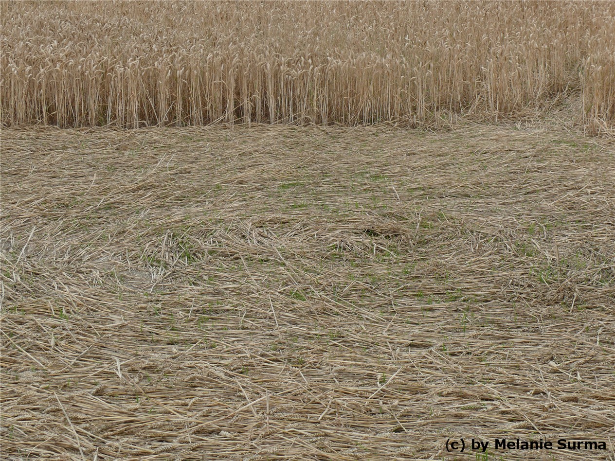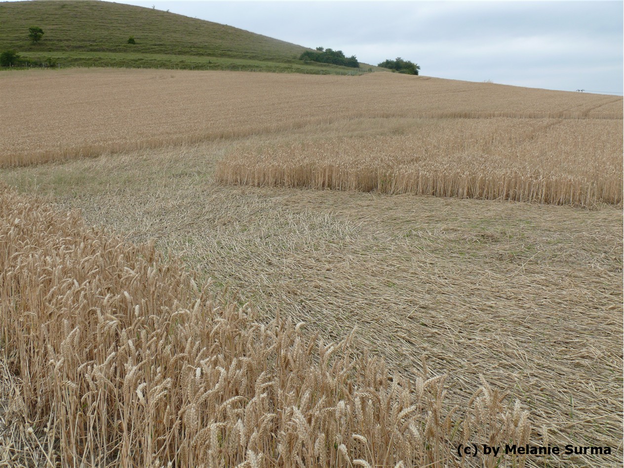 Eine weitere Besonderheit stellen die feinen, perspektivischen Linien des 3D – Musters dar. Auf der Luftaufnahme sind sie deutlich zu sehen und vermitteln den plastischen 3D – Effekt. Steht man im Feld und blickt direkt auf die Linien sieht man – gar nichts! Geht man ein paar Meter zur Seite und blickt schräg auf das Feld, werden die Linien wieder sichtbar. Steht man direkt davor verschwinden sie wieder. Hier wurde wohl nur der obere Bereich der Ähren in einem bestimmten Winkel gebogen, um Linien zu erzeugen, die nur bei einem Blick von oben deutlich in Erscheinung treten.