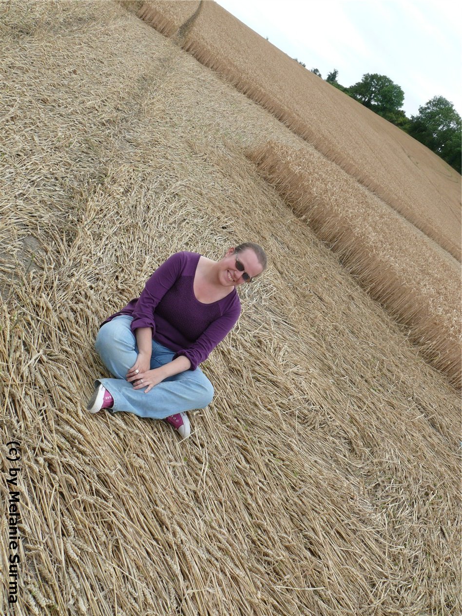Auch der Cley Hill ist ein Ort, von dem eine besondere Energie ausgeht. Es herrschte eine friedvolle Ruhe, abgeschiedenen von der Hektik des Alltags, und weit und breit war kein Mensch zu sehen. Obwohl auch dieses Feld von Stacheldraht umgeben war, wurde hier zum Glück an einer Stelle ein Loch hinein geschnitten, durch das man sich schlängeln konnte. Diesmal konnten wir die Formation also betreten. Die Präzision und die „Legetechnik“ sind absolut beeindruckend. Obwohl auch diese Formation schon drei Wochen alt war und bereits dementsprechend viele Besucher drübergelatscht waren, war das Getreide an vielen niedergelegten Stellen noch intakt und lag nicht vollständig am Boden, sondern in einem Winkel von ca. 30°. Man konnte immer noch den „fließenden Effekt“ erkennen.