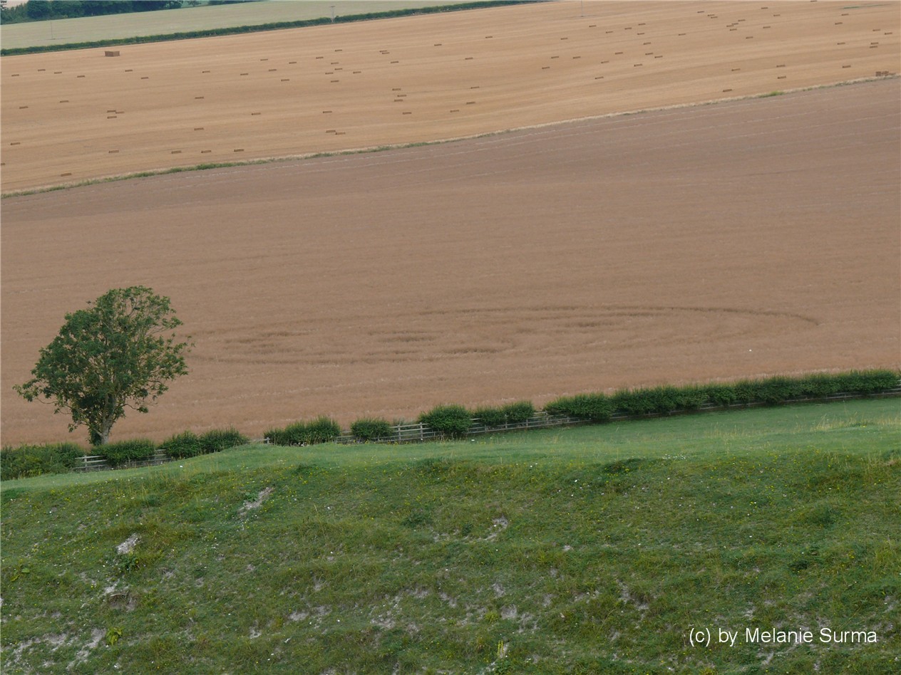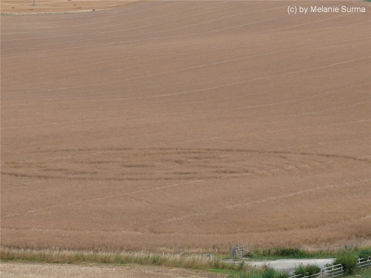 In Old Sarum entstand dieses Jahr der erste Kornkreis Anfang Mai in einem Rapsfeld. Dieses Rapsfeld war natürlich zur Zeit unserer Ankunft dort schon längst abgemäht und eigentlich waren wir auch nicht wegen des Kornkreises dort, sondern um Old Sarum selbst zu besichtigen. Auch hier handelt es sich um eine altertümliche Siedlung in Form einer Ringwallanlage. Umso überraschter war ich jedoch, als ich den Ringwall entlang spazierte und im Feld schräg unter mir plötzlich die Formation sah. Sie war immer noch da. Das Rapsfeld war längst abgemäht, das Feld umgepflügt und mit einer Getreideart neu besät worden. Doch die Formation war immer noch sichtbar! Die neuen Getreidepflanzen wuchsen im Bereich der Formation anders als im restliche Feld, so dass diese in allen Details immer noch deutlich zu sehen war. Ich dachte, ich traue meinen Augen nicht! Eine rein mechanische Herstellung mit Seil und Brett, wie es immer wieder unterstellt wird, ist bei dieser Formation somit völlig auszuschließen.